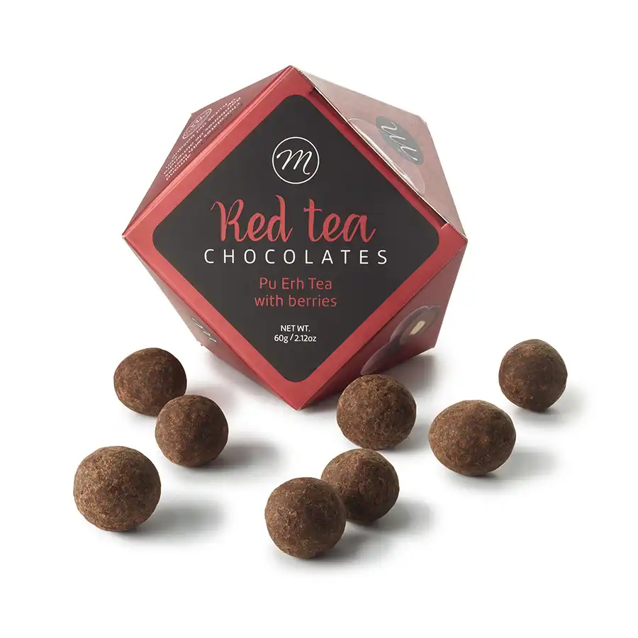 Tumma suklaamanteli Pu-erh-teellä ja punaisilla marjoilla (Red Tea Chocolate – Pu Erh & Red Berries) on intensiivinen ja hienostunut yhdistelmä tummaa suklaata, mantelia ja kypsytettyä Pu-Erh-teetä.